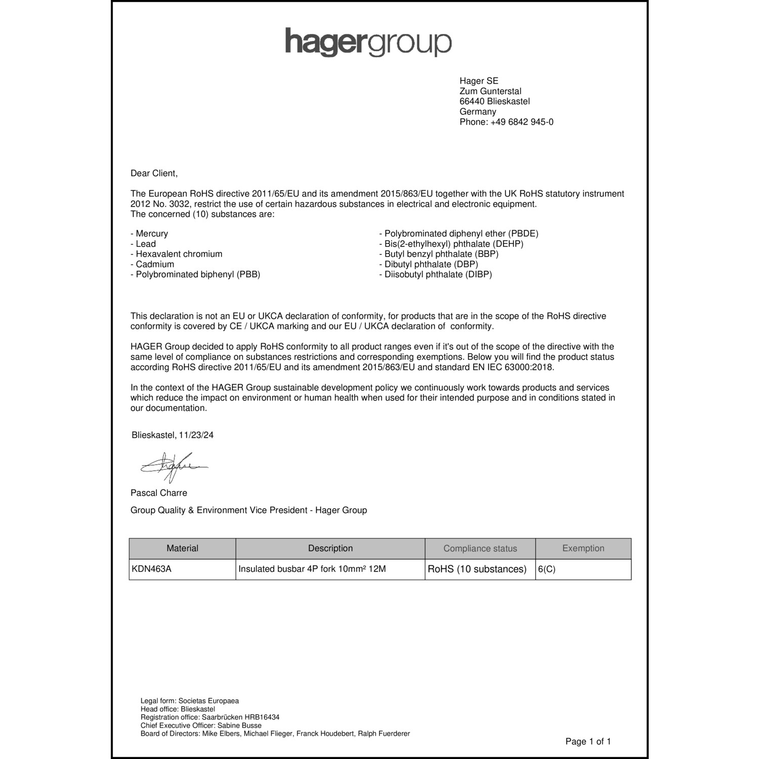 KDN463A HAGER Phasenschiene 4P Gabel 10mm² 63A 12M